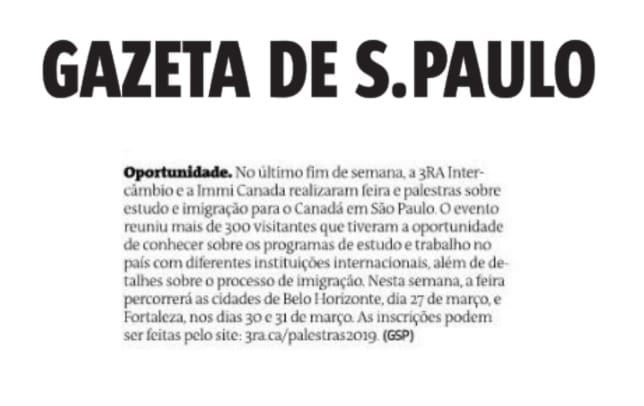 O ciclo de palestras sobre Estudo e Imigração para o Canadá já está a todo vapor. O evento, que traz informações diversas para quem deseja iniciar o plano Canadá, está sendo destaque em vários meios de comunicação no Brasil, tanto em plataformas digitais, quanto impressas.